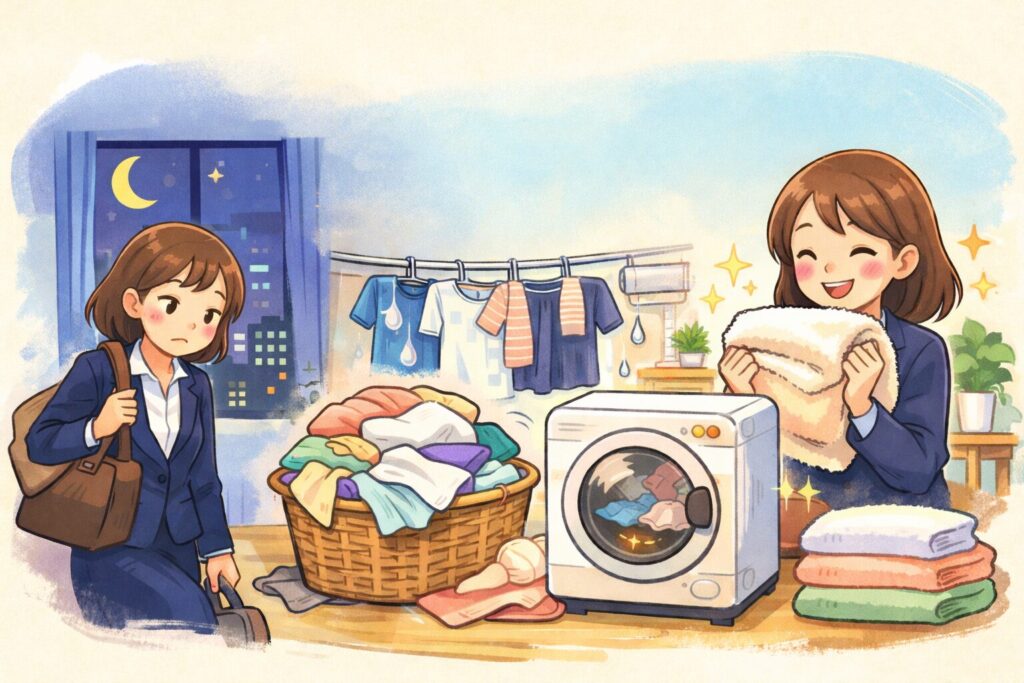 それでも残業や出張で帰宅が遅くなると、つい後回しになりがちなのが洗濯ですよね。